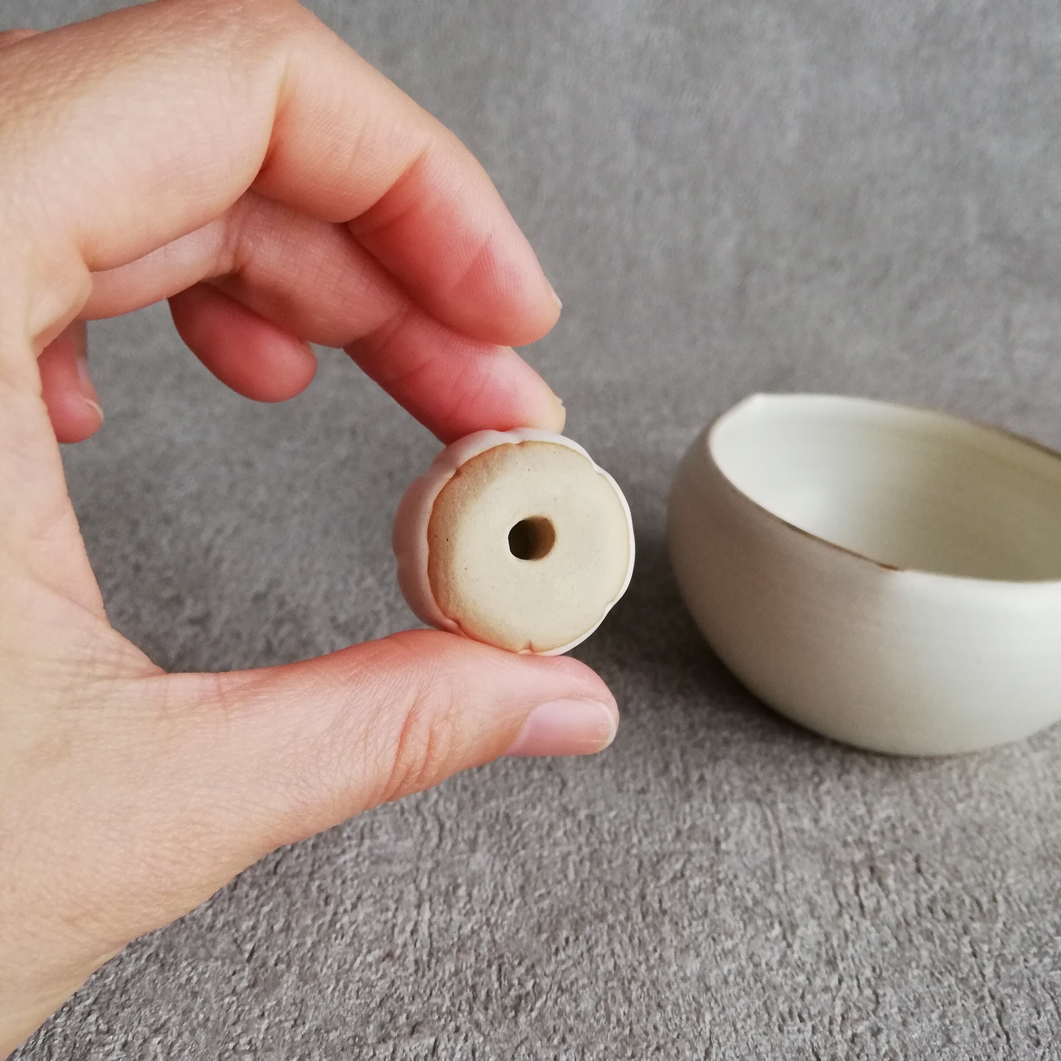 「花留め」は土の塊を手で丸めて一つひとつ制作しています。