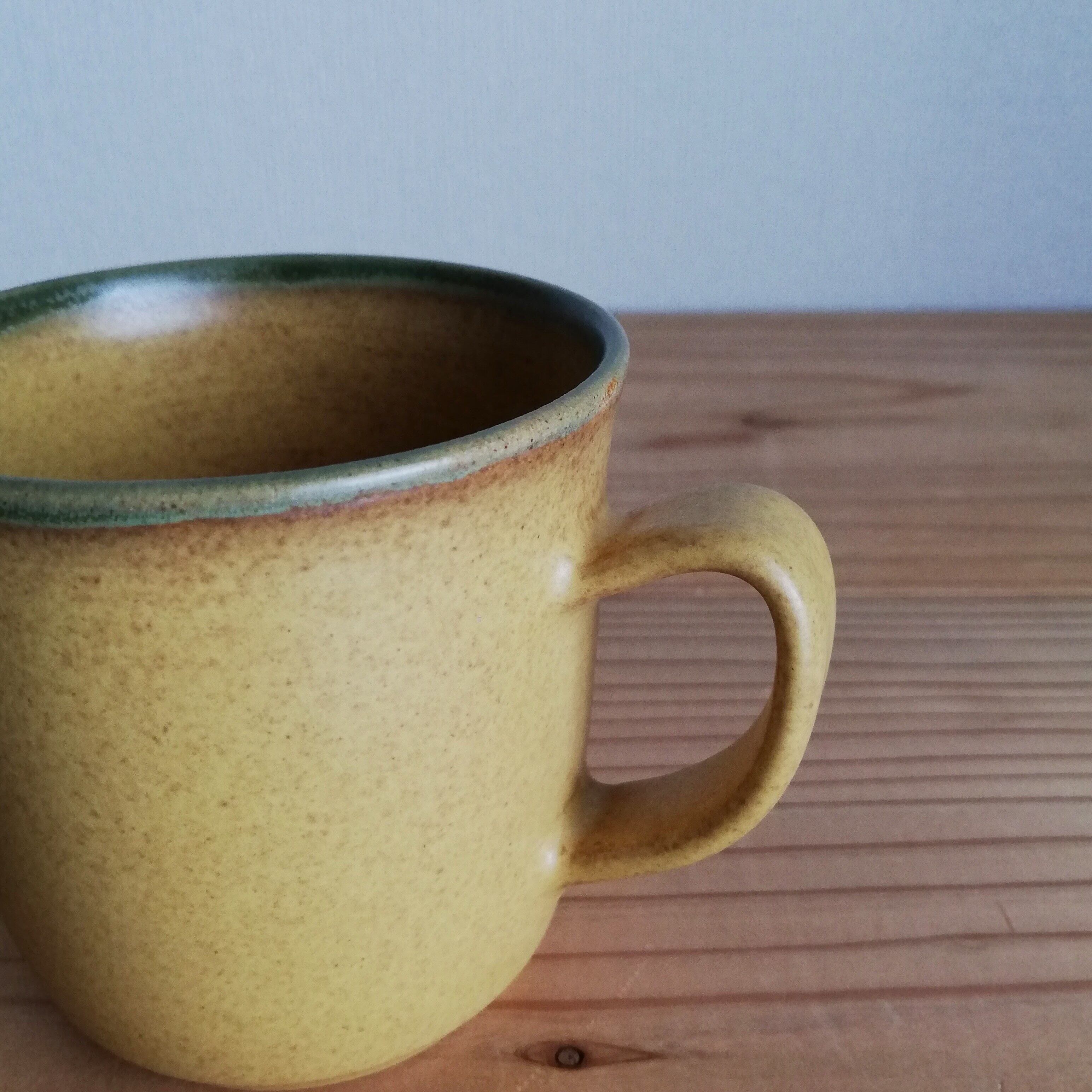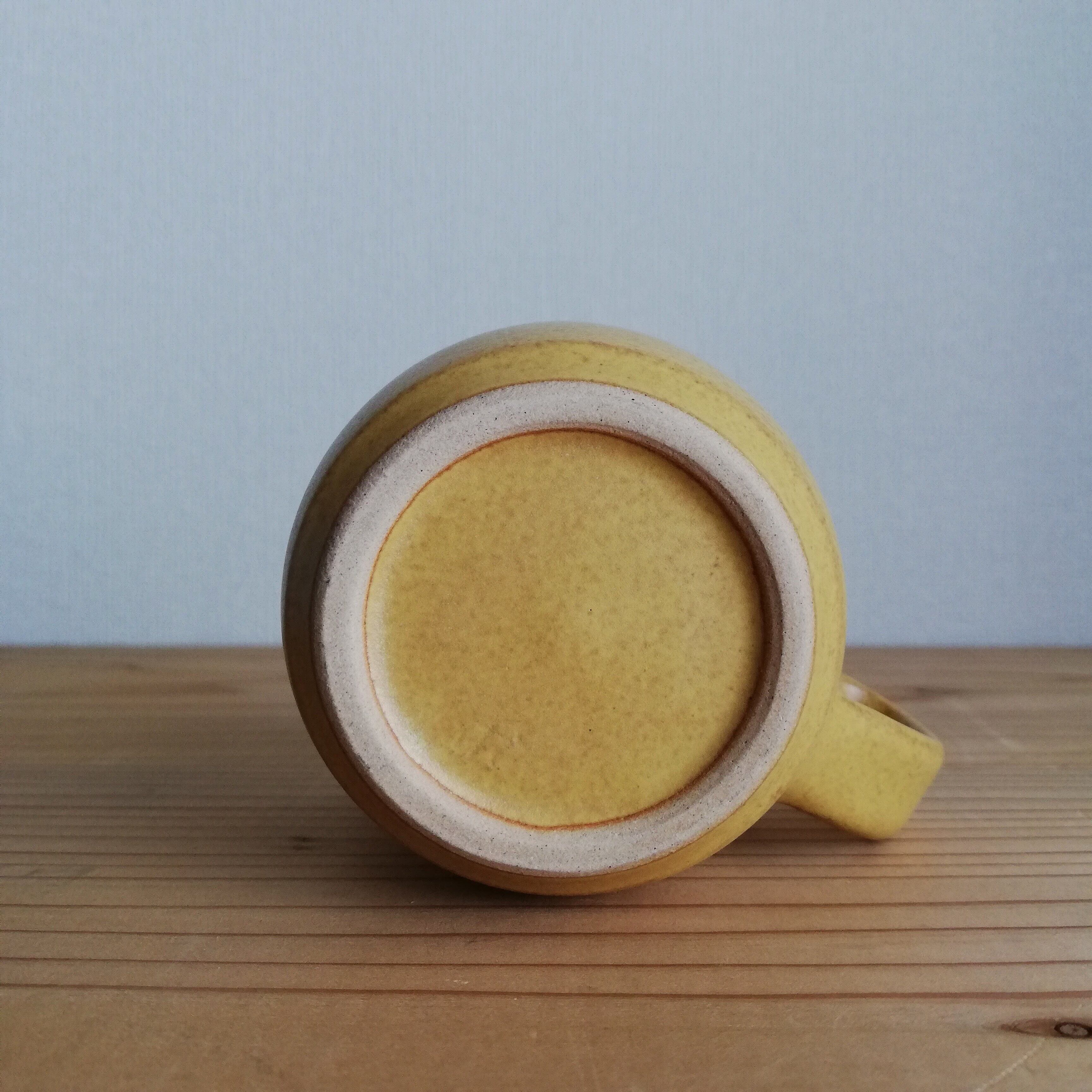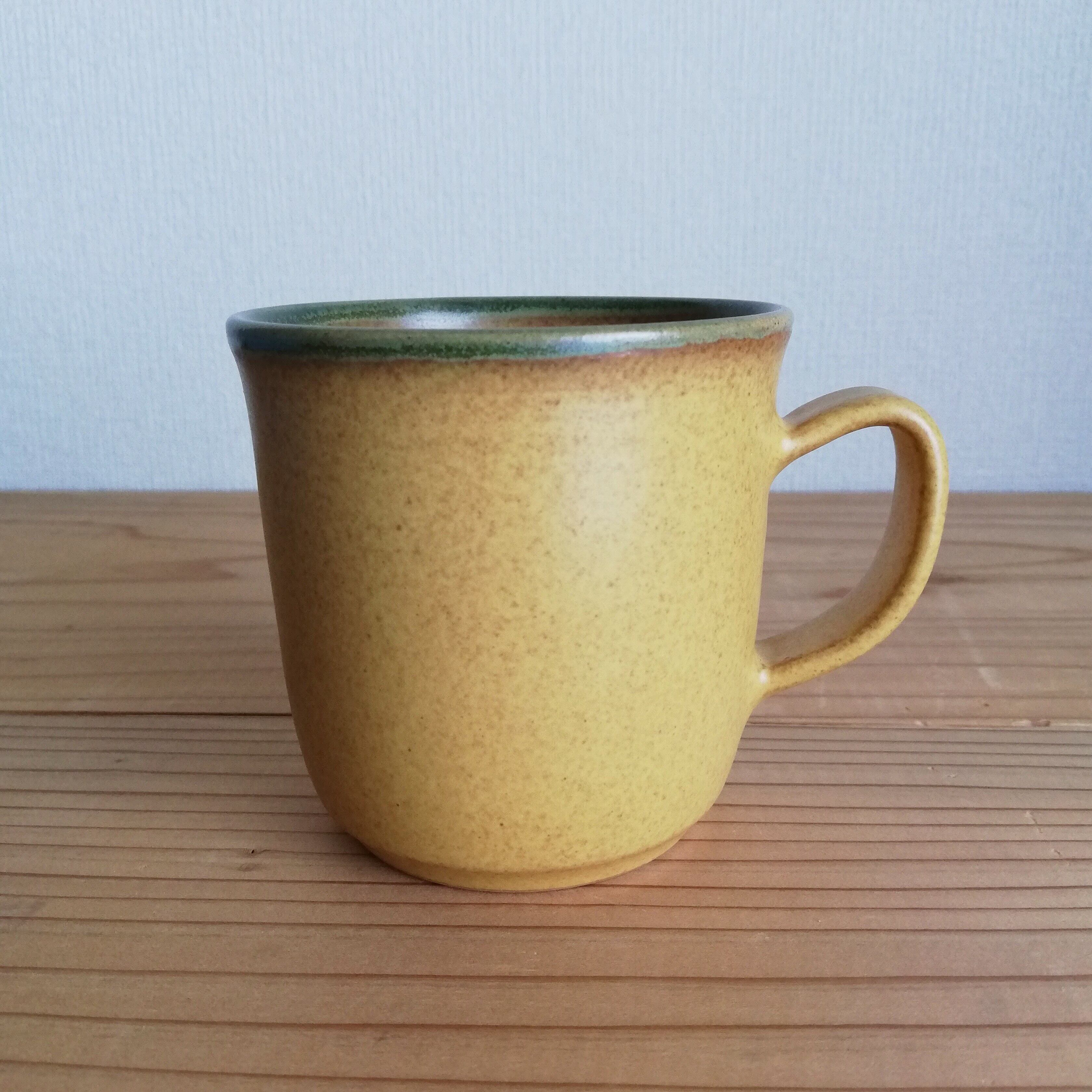 レトロ感のあるイエロー系のマグカップ。