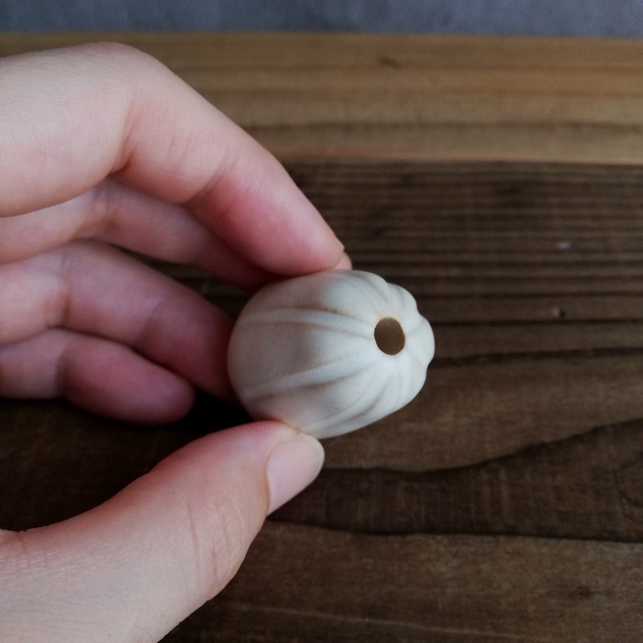 「花留め」は土の塊を手で丸めて一つひとつ制作しています。